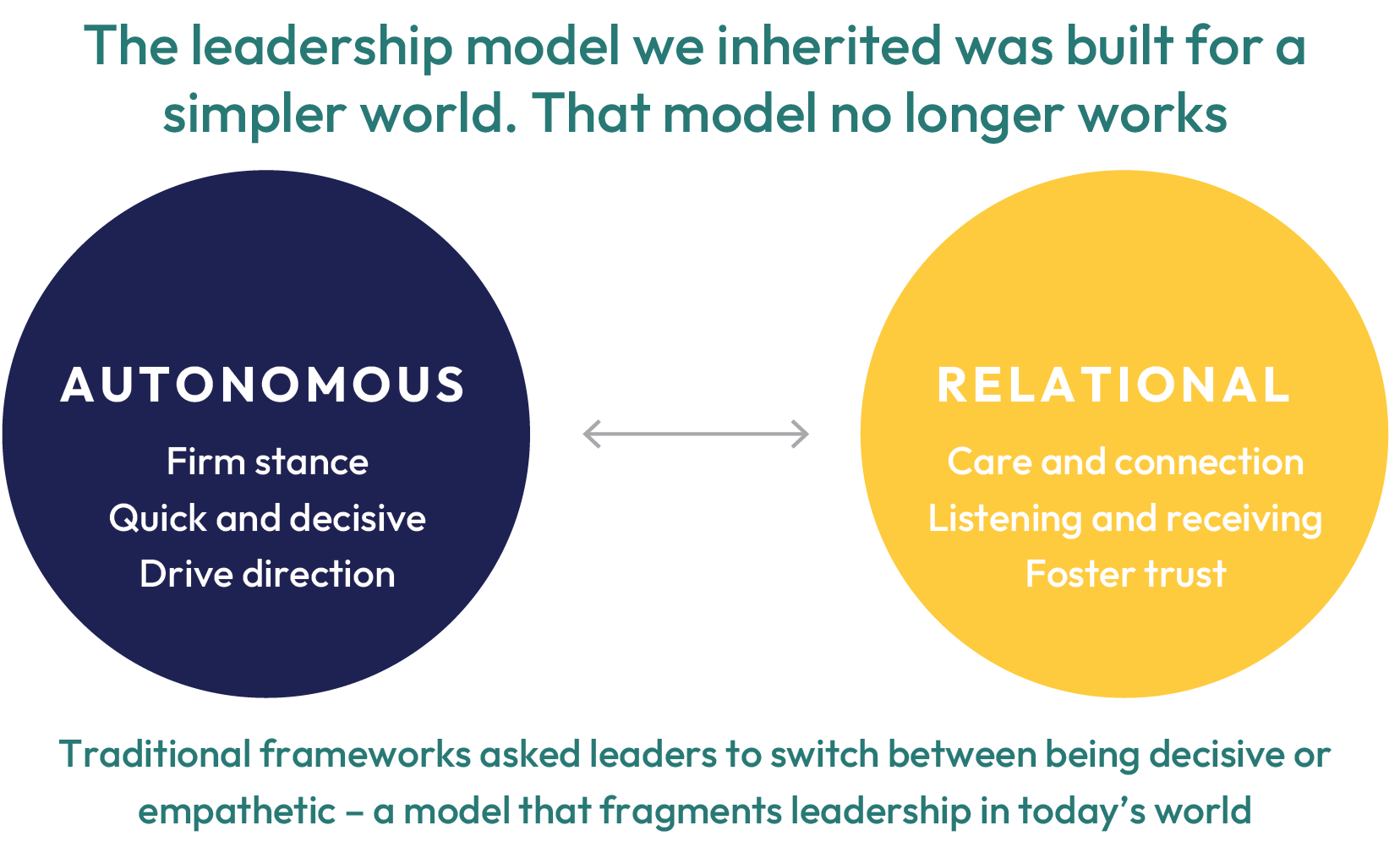 Evolving our language is about rewiring the leadership mindset – an upgrade to our cognitive framework about what effective leadership looks like. Integration isn’t about compromise or finding a “softer” middle ground. It’s about moving from fragmented toggling - where leaders consistently switch between being “directive” or “collaborative” - to a coherent presence that holds both simultaneously. Integrated leaders don’t ask, “Which mode should I switch into now?” Instead, they ask, “What does this moment require - and how can I bring my full, integrated self to meet it?” This starts by replacing the binary ‘or’ with the integrated ‘and’.
