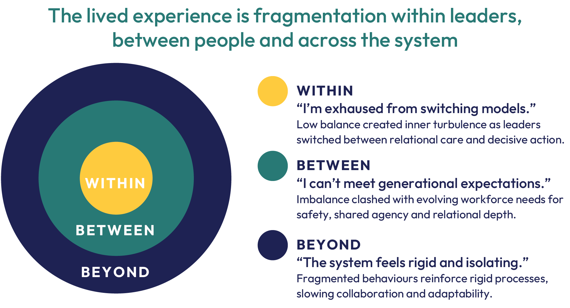 Leaders described a draining cycle of “mode-swinging” between empowering their teams and taking control. Because they view these as opposing binaries rather than integrated capacities, they experienced energetic toggling where leadership felt both exhausting and performative.